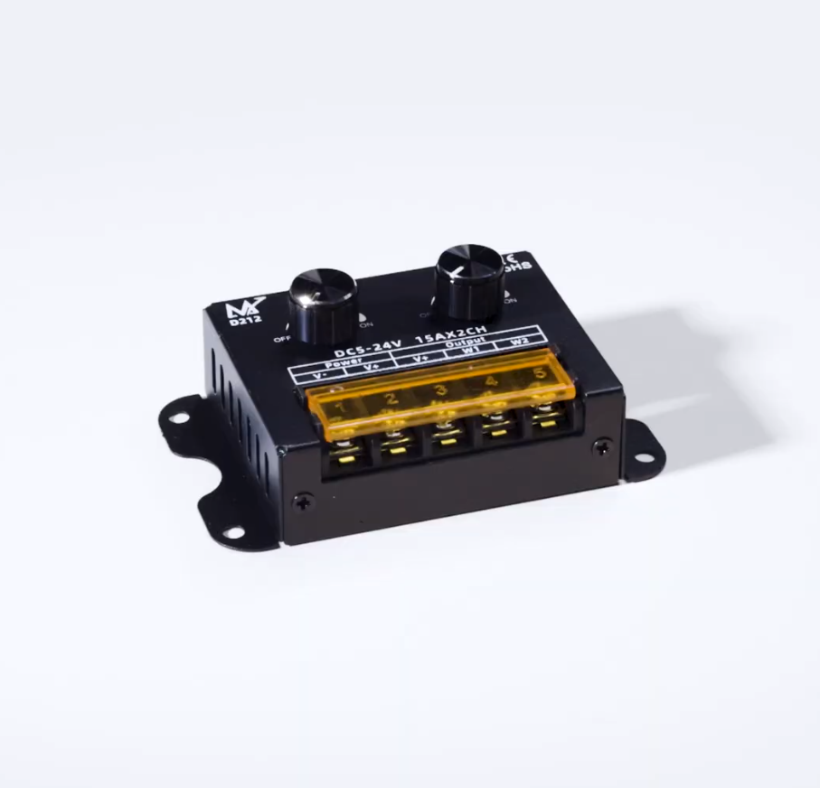 The DM-212 is a compact, dual-channel dimmer designed for maximum flexibility in low-voltage lighting applications. Supporting a universal input and output range of 5–24V DC, the DM-212 is ideal for projects requiring precise dimming control across a wide range of LED configurations. Unlike models with built-in power supplies, this unit allows users to integrate their own DC power source—offering greater adaptability in custom installations. Each channel supports up to 15 amps of output, and the fully enclosed, IP65-rated steel chassis ensures durability in both indoor and protected outdoor environments. Powder-coated and lightweight, the DM-212 delivers reliable, smooth dimming in a compact footprint built for professional-grade performance.